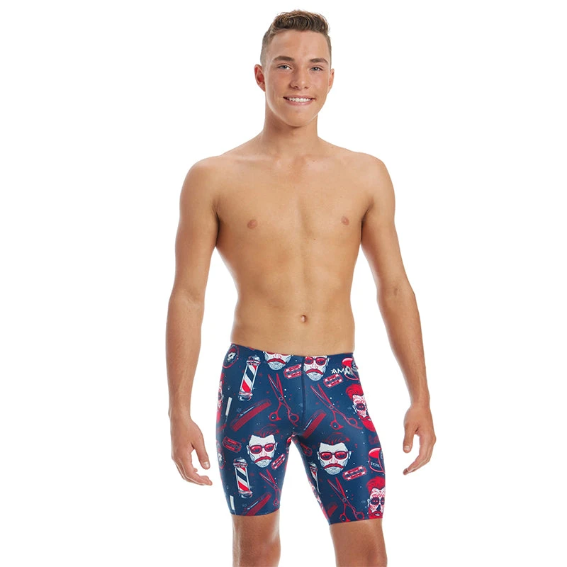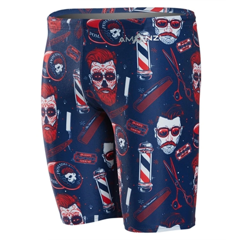 Hey, bad boy! Are you on the hunt for a cool style? You’re going to flip for the AMANZI Barber Chop Jammers. These bold jammers feature a hip barber style print in bold shades of cherry red and cream. With pomade, a comb, razor, and a bearded barber, this swimsuit has everything that you need to look smokin’ hot!