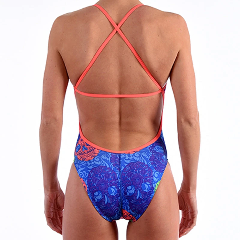 The Dolfin Bellas Sugar Skull Womens Cross Back One Piece Swimsuit features a two tone blue background with a pink, green and purple skull pattern. Thin pink straps come together in the back to form a cross back design to allow for full range of movement and maximum comfort. Swim with confidence in this comfortable swimsuit.