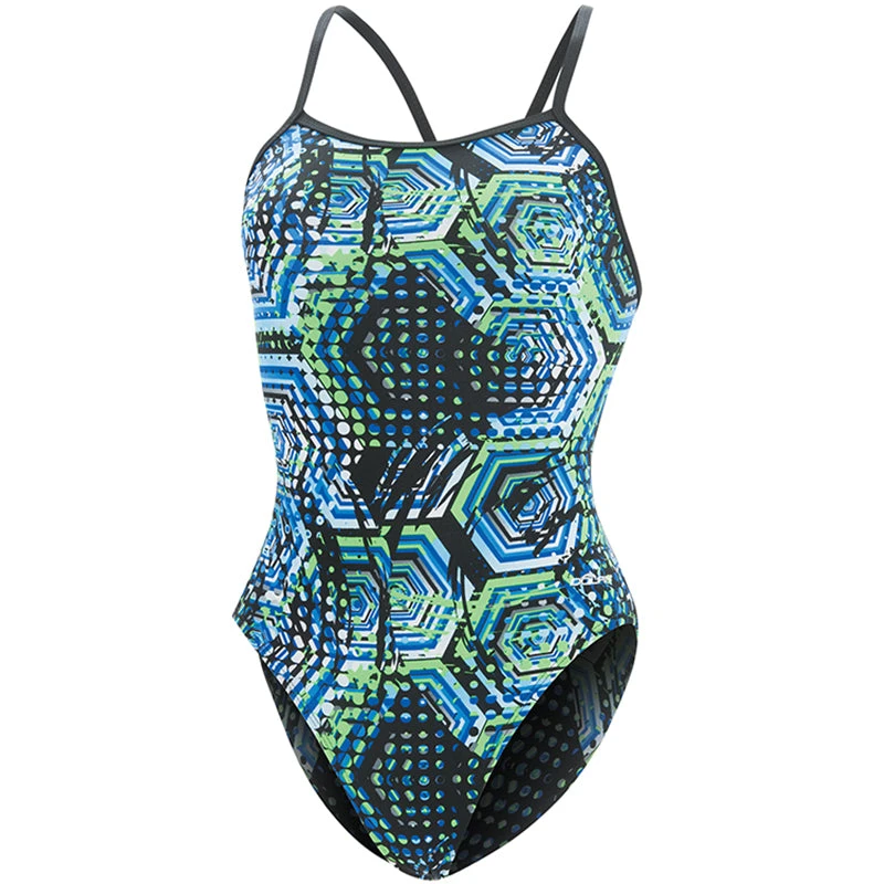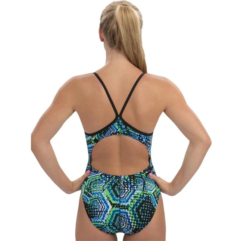 Step boldly up to the block in a suit that’s got your back! Fabricated in 100% Polyester, this v-back swimsuit maintains four-way stretch and vibrant color throughout a long competition season. Make a strong statement in an eye-catching blue/green Hive print.