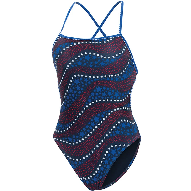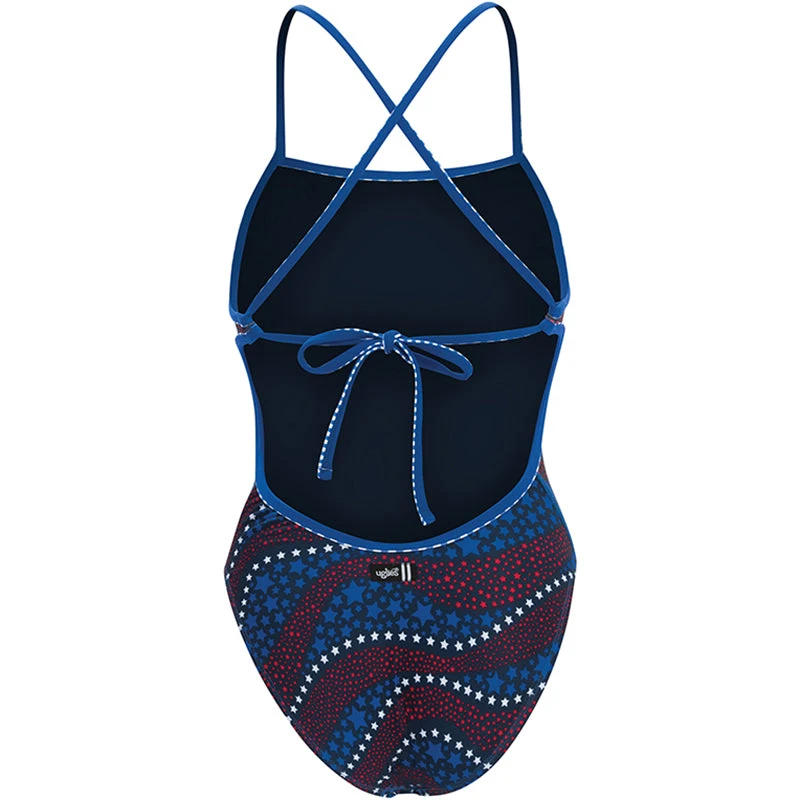 Show off your American pride in this sporty yet stylish One-Piece swimsuit. Featuring an abstract All-American print and a flirty tie-back, you’ll love how this suit looks and feels! Product code: 0910AMERI