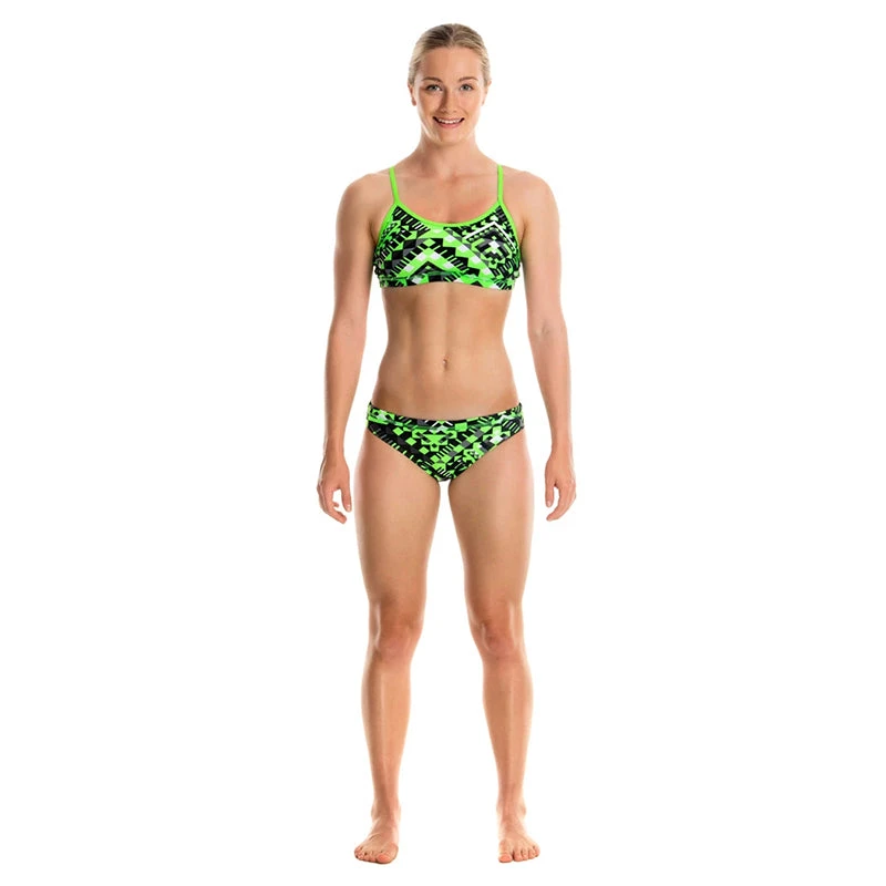 A firm fitting crop top and hipster brief suited to the sporty girl. It’s a secure fit with underbust and waist elastic and drawcord in the brief. Features a single shoulder bind strap finish.