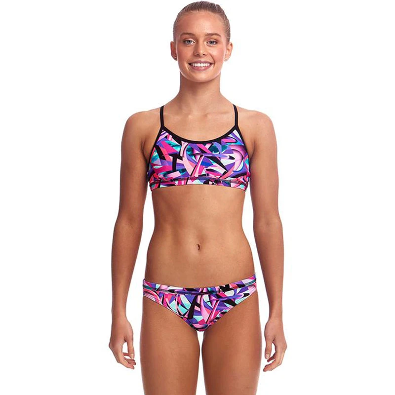 A firm fitting crop top and hipster brief suited to the sporty girl. Its a secure fit with underbust and waist elastic and drawcord in the brief. Features a single shoulder bind strap finish.