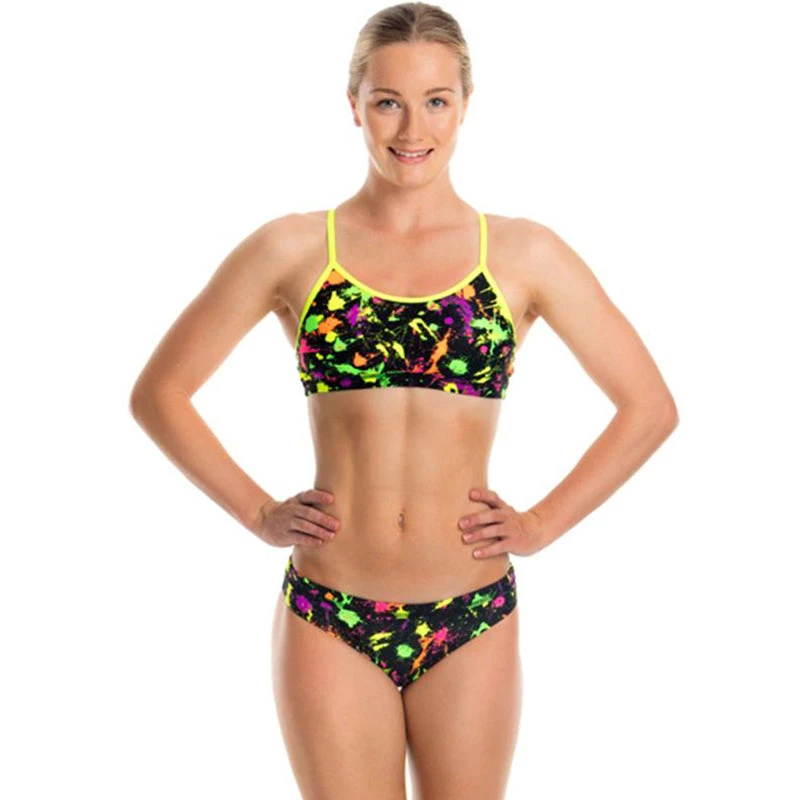 A firm fitting crop top and hipster brief suited to the sporty girl. It’s a secure fit with underbust and waist elastic and drawcord in the brief. Features a single shoulder bind strap finish. Available in sizes 8 – 14.