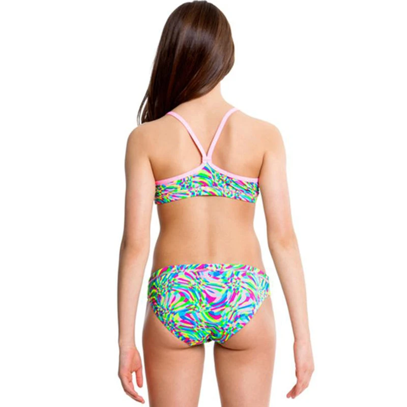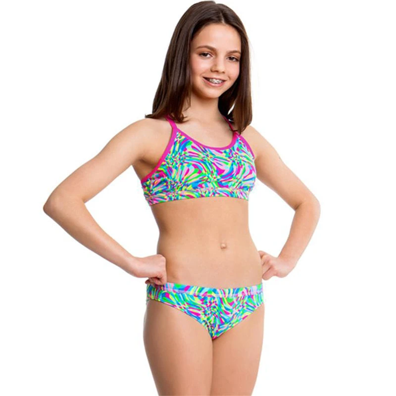 A firm fitting crop top and hipster brief suited to the sporty girl, with underbust and waist elastic and drawcord in the brief. Features single bind shoulder straps.