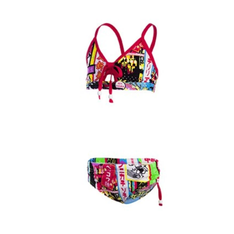 A firm fitting triangular top with gather detail and beaded ties matches back with a hipster brief with side gathering for a fresh beach bikini look. Front lined and with a drawcord brief, it is perfect for catching waves and jumping in the pool.