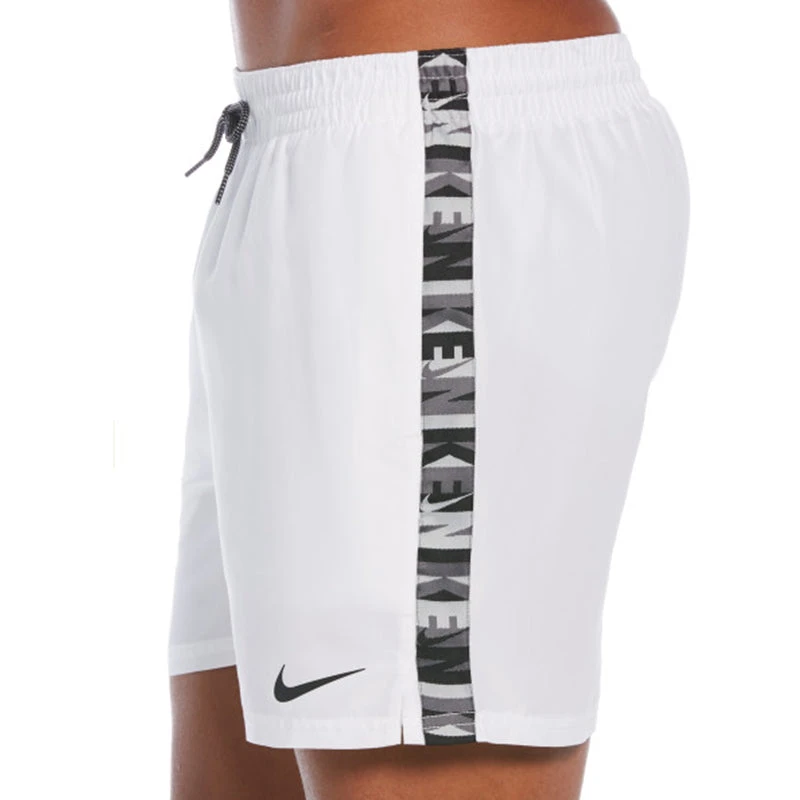 Make waves in the Men’s Nike Swim Logo Tape 5″ Volley Short. Branded tape down the sides adds eye-catching detail to these sporty solid swimming trunks. They’re made with a lightweight polyester fabric and feature a stretch waistband with exterior drawcord for flexible comfort. A built-in mesh brief ensures a secure and supportive fit. On seam pockets with mesh pocket bags provide convenient water drainage and a media pocket offers additional hands-free storage space. (NESSC473)