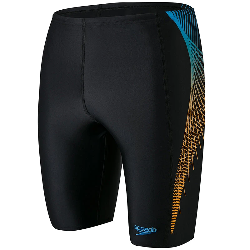 Cut a sleek silhouette in the pool with this black jammer designed with a stylish graduated panel print. Ideal for everyday swim fitness, it includes a drawstring waist and integral support so you can focus on your training. Chlorine resistant and made from recycled yarns, our soft PowerFlex Eco fabric lasts twice as long as standard swimwear fabrics – good for you and good for the environment. (804512F317)